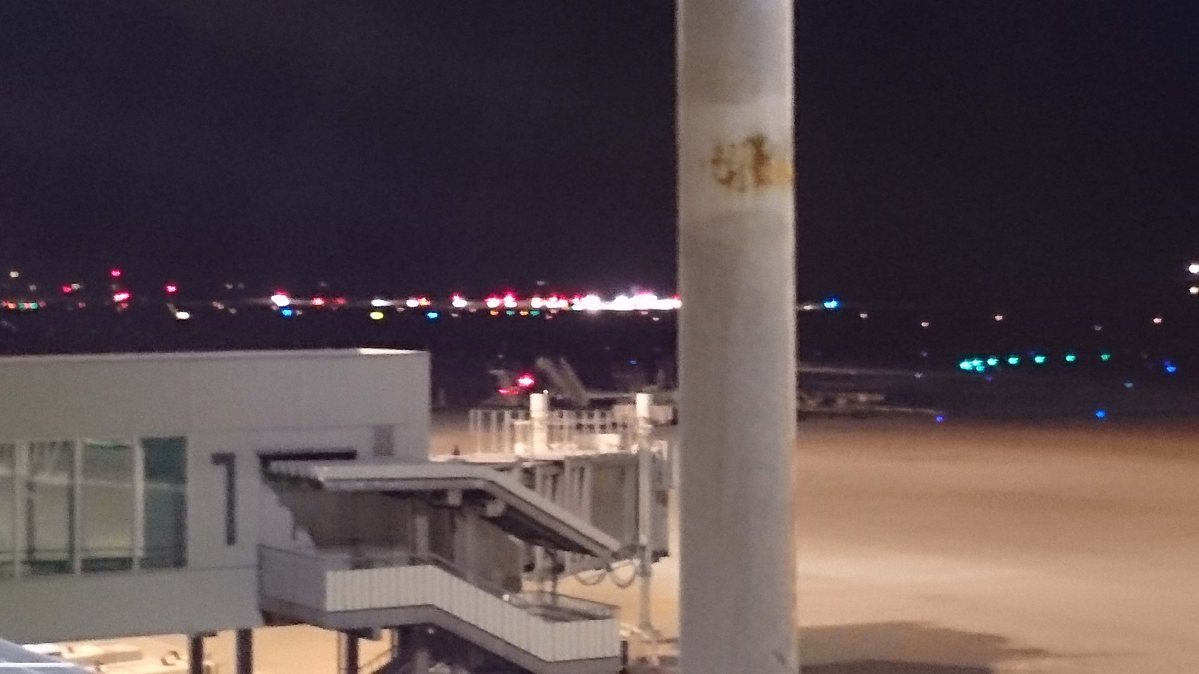 が、チェックインを済ませて、状況が変わるまではのんびりしていようとターミナル内のベンチで一息ついていると、「今日の残りの2便についても欠航が確定しました」という先程のカウンターで聞いた望みを打ち砕くアナウンスが入り、当日中に東京に帰ることが不可能な状況に、orz。こうなるともう吹っ切れたので一旦空港の展望デッキに行って、原因になった小型機の事故現場を眺めてやろうと思い、欠航手続きの列に並ぶのは後回しにして、ターミナルの展望デッキへ。しかし、空港は広い訳で小型機の事故現場は遥か遠くで緊急車両の赤い光や、照明の白い光が遠くに見えるだけでした。